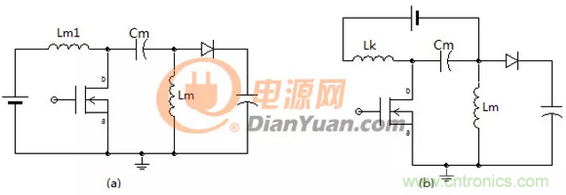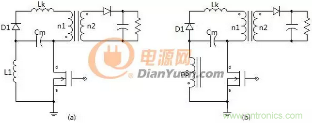 圖2中的兩個(gè)電路是一樣的只是形式不同,如果去掉電容Cm電路的左側(cè)就如同一個(gè)帶去磁繞組的正激變壓器初級(jí)側(cè),同樣這里的線圈n1、n3也要采用雙線并繞,如果兩線圈耦合的好二極管D1是可以省掉的,如果耦合的不好就會(huì)產(chǎn)生圖1中(a)的效果會(huì)有一部分無功損耗。