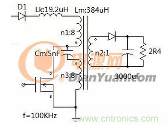 假設(shè)初級(jí)線圈耦合的比較好可以去掉原D1二極管,因漏感和電容會(huì)發(fā)生震蕩所以把D1串入到輸入端只為方便觀察波形。在有的應(yīng)用中反而要加大這個(gè)LC震蕩,比如QR模式的軟開關(guān)。