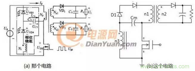 有一篇叫做“反激變換器繞組鉗位電路的設(shè)計(jì)與分析”的文章與這里的電路非常的相似。那個(gè)電路所具有的優(yōu)點(diǎn)也是這個(gè)電路的優(yōu)點(diǎn),從而驗(yàn)證了之前的理論和仿真結(jié)果。不過這里的電路有著更優(yōu)異的特點(diǎn),見下面兩個(gè)電路對(duì)比圖:
