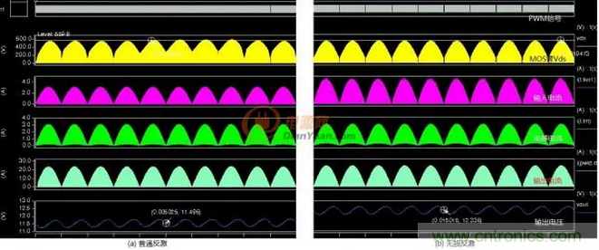 圖4-3-2:普通反激PFC與無損吸收PFC波形對(duì)比