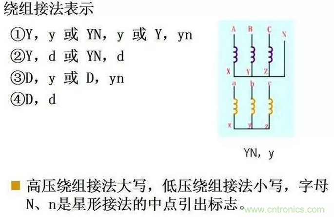 如果是星形或曲折形聯(lián)結有中性點引出時,則分別用YN或ZN,yn或zn表示。變壓器按高壓、低壓繞組聯(lián)結的順序組合起來就是繞組的聯(lián)結組。今天主要講解Y和D型接法,Z型接法比較少見,我們通過Y和D型完全可以理解。通過典型的幾種接法,讓大家迅速的理解。