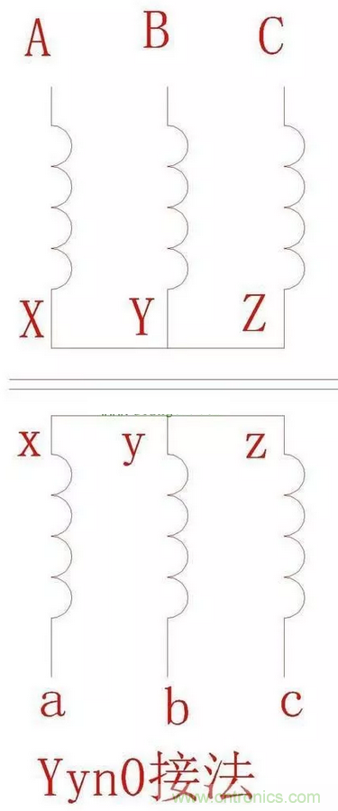 2.Yyn0的意義:Y:高壓側星型接法,無中性點引出;y:低壓側星型接法;n:中性點引出;0:高低壓差位差0度。