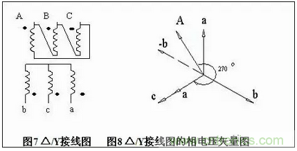 如圖7所示,識別圖中△/Y的接線圖它屬于幾組,根據(jù)上面的方法,畫出次邊a、b、c三相相電壓矢量圖,從接線圖中可以看出原邊A相繞組的頭連接B相繞組的尾作為原邊A相引出線,因此我們把原邊相電壓矢量A畫到次邊矢量a和-b中間,而次邊C相繞組的頭作為次邊a相輸出,因此我們把次邊矢量C當成是矢量a調相來使用,然后以原邊A相順時旋轉到次邊a相,它們的夾角為270°,因此這個接線圖為 △/Y-9聯(lián)接組,見圖8。