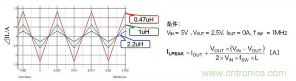 在這里,為加深對電感工作的理解,進一步說明電感值變化時電感電流如何變化的情形。下圖表示在相同工作條件下將電感值設(shè)為0.4μH、1μH、2.2μH時ILPEAK。