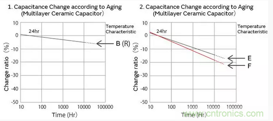 高誘電系的積層陶瓷電容器的靜電容量,以經(jīng)過125℃以上的熱處理24小時(shí)后的值作為基準(zhǔn),與時(shí)間成對數(shù)關(guān)系直線性下降。請參考如下本公司制品靜電容量老化特性的代表例子。
