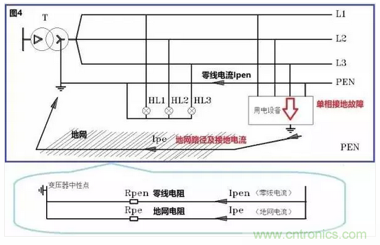 圖4中,變壓器中性點(diǎn)接地,而用電設(shè)備的外殼直接接地。
