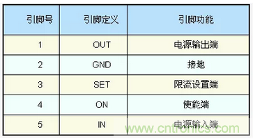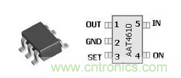 我們?nèi)砸訟AT4610為例,說明電子開關(guān)實現(xiàn)過流保護(hù)的工作原理。AAT4610采用SOT-23塑料封裝(如圖1),5個引腳的定義見表1。