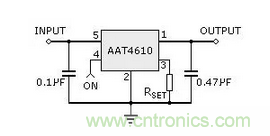 AAT4610的應(yīng)用電路十分簡單,只要外接兩只濾波電容和一只電阻器RSET,便可實現(xiàn)過流保護(hù)功能,如圖3。