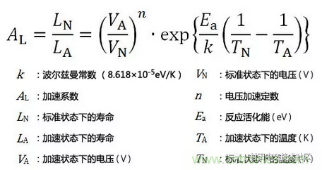 下面的加速公式是基于阿列紐斯法,利用電壓加速系數(shù)(※1)及反應(yīng)活化能(※2)推算。