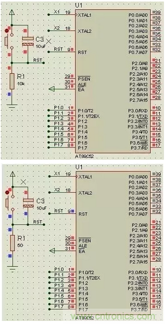 大家可以看到復位電路中電阻R1=10k時RST是高電平 ,而當R1=50時RST為低電平,很明顯R1=10k時是錯誤的,單片機一直處在復位狀態(tài)時根本無法工作。出現(xiàn)這樣的原因是由于RST引腳內含三極管,即便在截止狀態(tài)時也會有少量截止電流,當R取的非常大時,微弱的截止電流通過就產(chǎn)生了高電平。