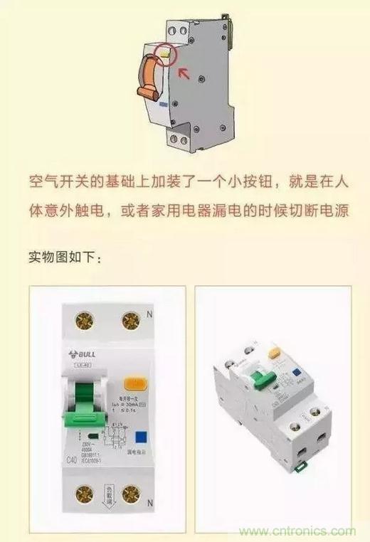 漏電斷路器是在空氣開(kāi)關(guān)的基礎(chǔ)上添加的一個(gè)小按鈕,當(dāng)發(fā)生意外漏電的時(shí)候,會(huì)引發(fā)開(kāi)關(guān)自動(dòng)切斷電源。