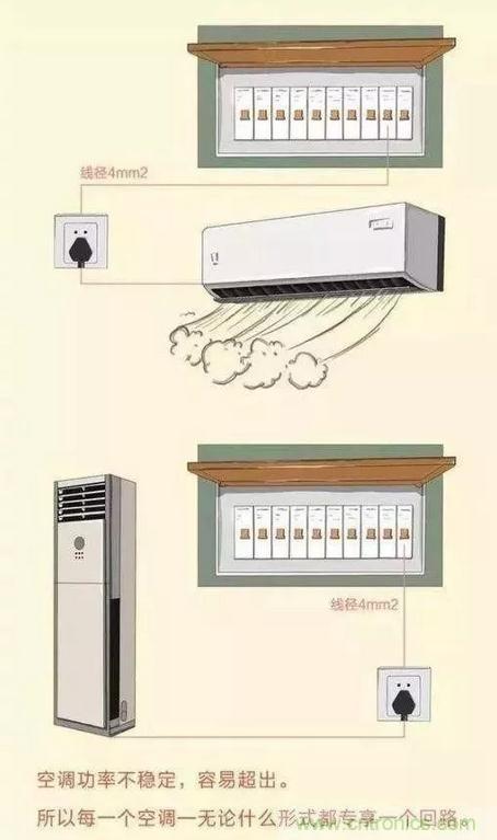 家裝中的空調(diào)一般都是單獨(dú)的線(xiàn)路,因?yàn)榭照{(diào)功率經(jīng)常不穩(wěn)定,容易出現(xiàn)超載的可能,因此每個(gè)可調(diào)都配有一個(gè)回路。