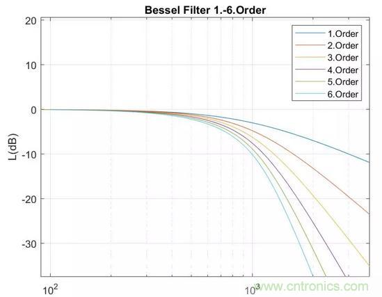 同Butterworth濾波器一樣,其階數(shù)越高,阻帶衰減也就越快,但是從通帶的幅值響應(yīng)看來(lái),其保留通帶部分的能力沒(méi)有Butterworth濾波器出色。Bessel濾波器具有最平坦的幅度和相位響應(yīng)。帶通的相位響應(yīng)近乎呈線性。Bessel濾波器可用于減少所有IIR濾波器固有的非線性相位失真。Bessel線性相位濾波器正是由于具有向其截止頻率以下的所有頻率提供等量延時(shí)的特性,才被用于音頻設(shè)備中。在音頻設(shè)備中,必須在不損害頻帶內(nèi)多信號(hào)的相位關(guān)系前提下,消除帶外噪聲。