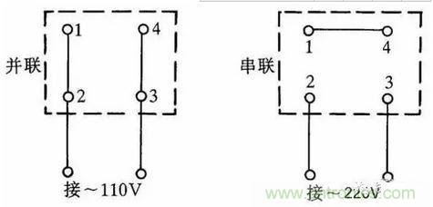 有的單相吹風機引出4個接線端子,接線方法如圖5所示。采用并聯(lián)接法應接入110V交流電源,采用串聯(lián)接法應接入220V交流電源。