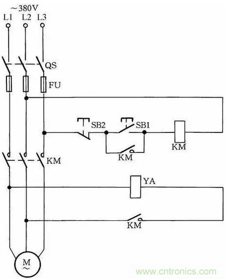 線路中YA為制動電磁鐵,在通電后,制動解除;在斷電后,YA立即制動。