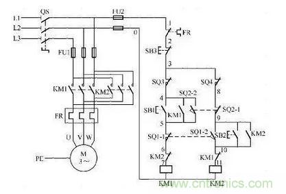 這個電路也很經(jīng)典,其實它是控制電機正反轉的加強版。利用行程開關實現(xiàn)自動往返的效果,按下SB1啟動按鈕KM1自鎖,小車開始正向走,當碰到限位開關SQ1時,KM1線圈失電KM2自鎖,小車又反向運行。只要不按下SB3這個停止按鈕,它就會循環(huán)運行。