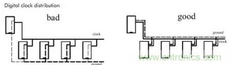 即短線規(guī)則,在設計時應該盡量讓布線長度盡量短,以減少由于走線過長帶來的干擾問題,特別是一些重要信號線,如時鐘線,務必將其振蕩器放在離器件很近的地方。對驅(qū)動多個器件的情況,應根據(jù)具體情況決定采用何種網(wǎng)絡拓撲結(jié)構(gòu)。