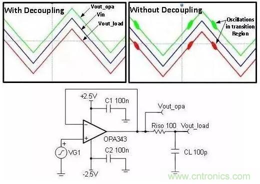 要回答這個問題,需要考證在不使用去耦器件時會出現(xiàn)什么問題。 圖 1 為帶去耦電容器和不帶去耦電容器(C1 和C2)情況下用于驅動 R-C 負載的緩沖電路。我們注意到,在不使用去耦電容器的情況下,電路的輸出信號包含高頻 (3.8MHz) 振蕩。對于沒有去耦電容器的放大器而言,通常會出現(xiàn)穩(wěn)定性低、瞬態(tài)響應差、啟動出現(xiàn)故障以及其它多種異常問題。