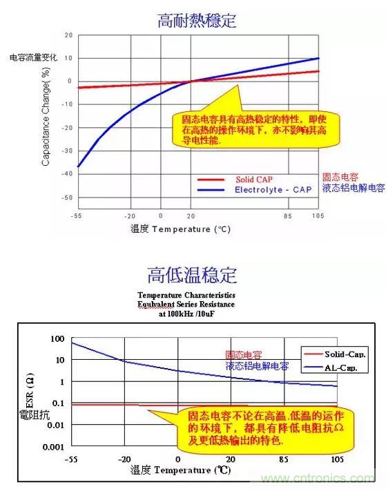 傳統(tǒng)電解電容比較容易受運(yùn)用環(huán)境地溫度和濕度影響,在高低溫穩(wěn)定性方面稍差。即使是在零下攝氏55度至105度,固態(tài)電容地ESR電阻抗可以達(dá)到在0.1~0.3歐母,但電解電容則會(huì)因溫度而改變。