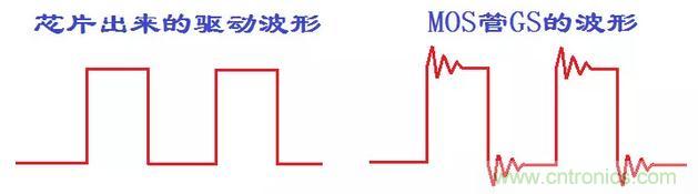 我們測(cè)試MOS管GS波形時(shí),有時(shí)會(huì)看到下圖中的這種波形,在芯片輸出端是非常好的方波輸出,但一旦到了MOS管的G極就出問(wèn)題了,有振蕩,這個(gè)振蕩小的時(shí)候還能勉強(qiáng)過(guò)關(guān),但是有時(shí)候振蕩特別大,看著都教人擔(dān)心會(huì)不會(huì)重啟。