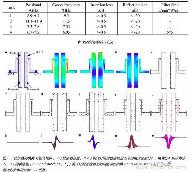 圖2 | 濾波器的聚類 可視化結(jié)果。a)濾波器模型。b-d)設(shè)計(jì)好的濾波器模型的表面電流密度分布、電場分布和磁場分布。e)網(wǎng)狀模型(meshed model)。f-j)設(shè)計(jì)好的濾波器上的典型動作集群(action cluster)可視化結(jié)果。k-o)典型動作集群的可微S 11 曲線。