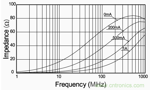 圖1是電流通過片狀鐵氧體磁珠時的阻抗值的變化示例。