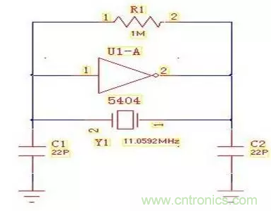 Y1是晶體,相當(dāng)于三點(diǎn)式里面的電感,C1和C2就是電容,5404非門(mén)和R1實(shí)現(xiàn)一個(gè)NPN的三極管,接下來(lái)分析一下這個(gè)電路。