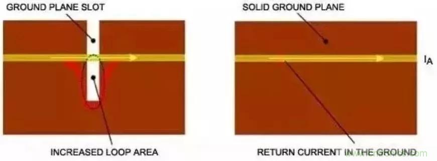返回電流通路須盡可能靠近主電流通道,將輻射磁場降至最小。這種布局有助于減小電流環(huán)路面積。返回電流的理想低阻通路通常是引線下方的接地區(qū)域—將環(huán)路面積有效限制在電介質(zhì)厚度乘以引線長度的區(qū)域。但是,如果接地區(qū)域被分割開,則會增大環(huán)路面積(圖3)。對于穿過分割區(qū)域的引線,返回電流將被強制通過高阻通路,大大提高了電流環(huán)路面積。這種布局還使電路引線更容易受互感的影響。