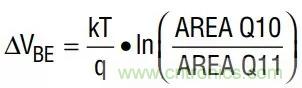 基本帶隙基準(zhǔn)電壓源背后的數(shù)學(xué)原理很有意思,因為它將已知溫度系數(shù)與獨(dú)特的電阻率相結(jié)合,產(chǎn)生理論上溫度漂移為零的基準(zhǔn)電壓。圖5顯示了兩個晶體管,經(jīng)調(diào)整后,Q10的發(fā)射極面積為Q11的10倍,而Q12和Q13的集電極電流保持相等。這就在兩個晶體管的基極之間產(chǎn)生一個已知電壓: