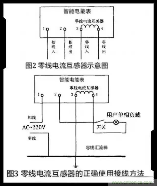 這種智能計量裝置采用微處理器和專門用于電能計量的芯片。它具有功能完善、計量精度高等等特點(diǎn)。而對于單相220V的用電用戶來說,現(xiàn)在的智能電能表在其內(nèi)部結(jié)構(gòu)中都已經(jīng)安裝了“零線電流互感器”。為了提高智能電能表的技術(shù)防護(hù)能力,在電源進(jìn)、出相線短接的情況下,它能夠檢測流過電能表的零線回路中的電流。而且國家電網(wǎng)在技術(shù)規(guī)范要求中明確提出,所有的智能電能表都必須安裝有零線電流互感器測量、記錄的功能。請看下圖所示