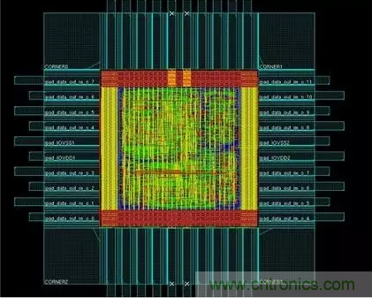 最后,將合成完的程式碼再放入另一套 EDA tool,進(jìn)行電路布局與繞線(Place And Route)。在經(jīng)過不斷的檢測(cè)后,便會(huì)形成如下的電路圖。圖中可以看到藍(lán)、紅、綠、黃等不同顏色,每種不同的顏色就代表著一張光罩。至于光罩究竟要如何運(yùn)用呢?