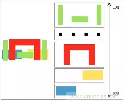 下圖中,左邊就是經(jīng)過電路布局與繞線后形成的電路圖,在前面已經(jīng)知道每種顏色便代表一張光罩。右邊則是將每張光罩?jǐn)傞_的樣子。制作是,便由底層開始,依循上一篇 IC 芯片的制造中所提的方法,逐層制作,最后便會(huì)產(chǎn)生期望的芯片了。