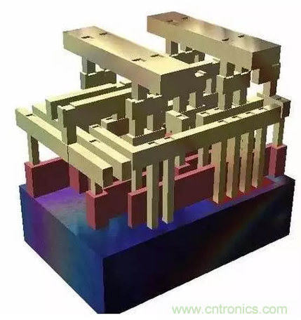 在開始前,我們要先認(rèn)識(shí) IC 芯片是什么。IC,全名積體電路(Integrated Circuit),由它的命名可知它是將設(shè)計(jì)好的電路,以堆疊的方式組合起來。藉由這個(gè)方法,我們可以減少連接電路時(shí)所需耗費(fèi)的面積。下圖為 IC 電路的 3D 圖,從圖中可以看出它的結(jié)構(gòu)就像房子的樑和柱,一層一層堆疊,這也就是為何會(huì)將 IC 制造比擬成蓋房子。