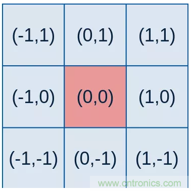 其中(x,y)(x,y)為點坐標(biāo),在圖像處理中可認(rèn)為是整數(shù);σσ是標(biāo)準(zhǔn)差。要想得到一個高斯濾波器的模板,可以對高斯函數(shù)進(jìn)行離散化,得到的高斯函數(shù)值作為模板的系數(shù)。例如:要產(chǎn)生一個3×33×3的高斯濾波器模板,以模板的中心位置為坐標(biāo)原點進(jìn)行取樣。模板在各個位置的坐標(biāo),如下所示(x軸水平向右,y軸豎直向下)