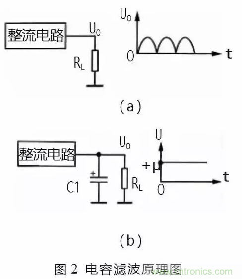 濾波電容 C1 的容量越大,對(duì)交流成分的容抗越小,使殘留在負(fù)載 RL 上的交流成分越小,濾波效果就越好。