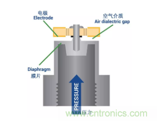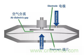 簡單地說,這些壓力傳感器是一種電容器,一種具有充電能力的裝置。當(dāng)壓力作用到傳感器內(nèi)部的膜片上時(shí),膜片就會(huì)收縮,或向固定電極彎曲,并改變電容。這種物理變化會(huì)導(dǎo)致電子輸出的變化,該裝置可將壓力讀數(shù)轉(zhuǎn)換成電流或電壓值。