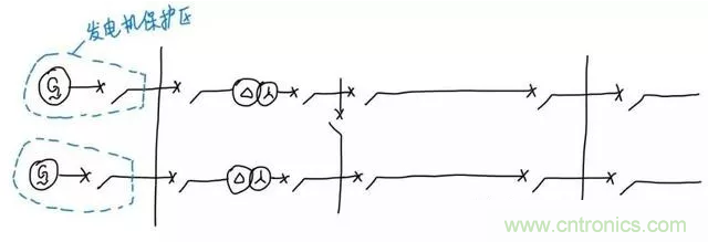 發(fā)電機(jī)接到低壓母線,再通過升壓變壓器把電壓升高(比如說升高成220kV),經(jīng)過輸電線路輸送到220kV變電站。這里就需要發(fā)電機(jī)保護(hù)、變壓器保護(hù)、母線保護(hù)和線路保護(hù)。對(duì)于發(fā)電機(jī)保護(hù),我們希望發(fā)電機(jī)故障時(shí)只切除故障的發(fā)電機(jī),不影響非故障設(shè)備正常運(yùn)行,而只切除發(fā)電機(jī)出口斷路器就可以實(shí)現(xiàn)只停故障發(fā)電機(jī)的目標(biāo),所以我們把保護(hù)區(qū)的邊界劃到了發(fā)電機(jī)出口斷路器旁邊的電流互感器,如下圖: