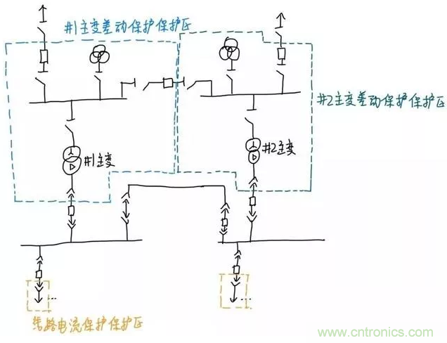 同理,對(duì)于后面的升壓變壓器,斷開變壓器兩側(cè)的斷路器可以實(shí)現(xiàn)切除變壓器而不切除其它元件,所以保護(hù)范圍就是變壓器兩側(cè)斷路器旁邊的電流互感器圍成的范圍。