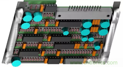 圖2 F-16戰(zhàn)斗機的雷達干擾裝置PCB,在所有的零組件下方有一個鋁制散熱器;千萬別讓機械工程師為了散熱器設計而自作主張布局PCB,以免犧牲電子功能。