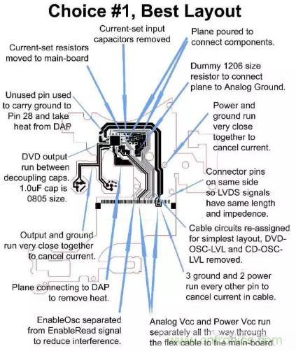 我在某家半導體公司任職時,做的是驅(qū)動PC用DVD刻錄機內(nèi)雷射頭的芯片;我看了一眼某客戶設計的軟性電路板原型,就知道他們?nèi)狈Ω咚倩蛏嵩O計方面的經(jīng)驗,畢竟他們之前做的CD刻錄機數(shù)據(jù)速率比較低,而且用的芯片不會產(chǎn)生太多熱度。而我們花了大半年的時間教客戶該怎么設計他們的PCB(圖5)。