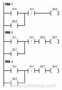 2. 單向順序停止控制電路就是要求按一定順序停止已經(jīng)執(zhí)行的各機(jī)構(gòu)。只有Q0.2被停止后才可以停止Q0.1,若想停止Q0.0,則必須先停止Q0.1。I0.4為急停按鈕。