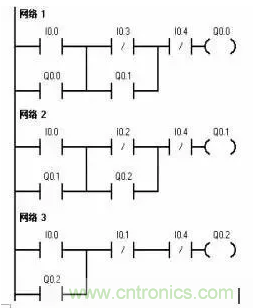 1. 單向順序啟動(dòng)控制電路是按照生產(chǎn)工藝預(yù)先規(guī)定的順序,在各個(gè)輸入信號(hào)的作用下,生產(chǎn)過程中的各個(gè)執(zhí)行機(jī)構(gòu)自動(dòng)有序動(dòng)作。只有Q0.0啟動(dòng)后,Q0.1方可啟動(dòng),Q0.2必須在Q0.1啟動(dòng)完成后才可以啟動(dòng)。