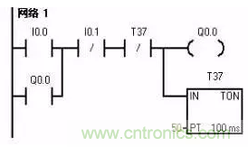 3.延時(shí)啟??刂齐娐吩撾娐芬笥休斎胄盘?hào)后,停一段時(shí)間輸出信號(hào)才為ON;而輸入信號(hào)0FF后,輸出信號(hào)延時(shí)一段時(shí)間才OFF。T37延時(shí)3 s作為Q0.0的啟動(dòng)條件,T38延時(shí)5 s作為Q0.0的關(guān)斷條件。