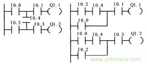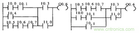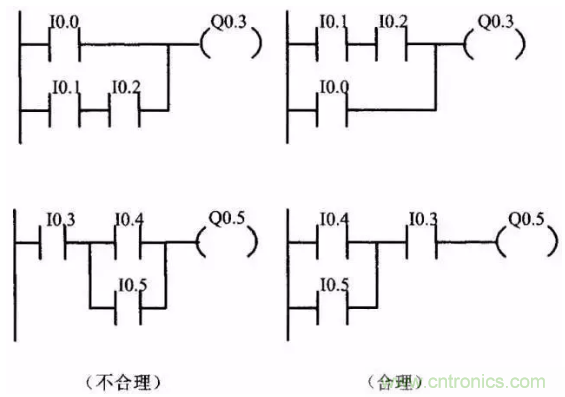 (3)幾個(gè)串聯(lián)支路相并聯(lián),應(yīng)將觸點(diǎn)多的支路安排在上面;幾個(gè)并聯(lián)回路的串聯(lián),應(yīng)將并聯(lián)支路數(shù)多的安排在左面。按此規(guī)則編制的梯形圖可減少用戶程序步數(shù),縮短程序掃描時(shí)間。