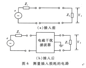 假定負(fù)載阻抗在插入前后始終保持不變,則P1=V12/Z,P2=V22/Z。式中V1是噪聲源直接加到負(fù)載上的電壓,V2是在噪聲源與負(fù)載之間插入電磁干擾濾波器后負(fù)載上的噪聲電壓,且V2<<V1。代入(1)式中得到
