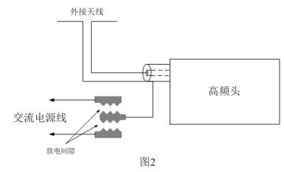 圖2是電視機(jī)防雷擊電路,圖中防雷擊電路是在PCB電路板上直接制作放電間隙(6mm)裝置,在外接天線端口就近與電網(wǎng)輸入引線之間加接這種放電間隙裝置。由于電視機(jī)本身沒(méi)有金屬機(jī)殼或機(jī)殼接地電氣連接點(diǎn),所以防雷放電間隙可直接利用電網(wǎng)輸入電源引線代替地線使用。