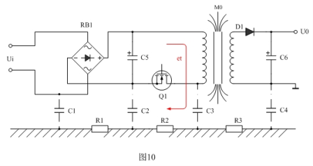 值得一提的是,開關(guān)電源變壓器初級線圈的漏感產(chǎn)生的反電動勢et,在所有干擾信號之中是最不容忽視的,如圖10所示。當電源開關(guān)管關(guān)斷的時候,開關(guān)電源變壓器初級線圈的漏感產(chǎn)生的反電動勢et幾乎沒有回路可釋放,一方面,它只能通過初級線圈的分布電容進行充電,并讓初級線圈的分布電容與漏感產(chǎn)生并聯(lián)諧振;另一方面,它只能通過輻射向外進行釋放,其中通過對地電容C3與大地相連,也是反電動勢et釋放能量的一個回路,因此,它對輸入端也會產(chǎn)生共模信號干擾。