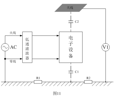 輻射干擾一般是通過電磁感應(yīng)的形式在空間進行傳播的,圖11是測試電子設(shè)備產(chǎn)生輻射干擾的基本方法,或表示電子設(shè)備產(chǎn)生的干擾信號通過電磁感應(yīng)向空中輻射的原理。圖11中,電子設(shè)備表示干擾信號源,V1表示測量儀表,C1表示電子設(shè)備對大地的電容,C2表示電子設(shè)備與天線偶合的電容,即:電子設(shè)備通過電場對天線產(chǎn)生感應(yīng),這里的天線也可以看成是被干擾的設(shè)備。圖11的測試方法就是測試電子設(shè)備周圍規(guī)定距離某處的電磁場強度,由于干擾信號一般都是一個頻率成份非常豐富的非正弦波,因此,無法對它進行直接測量,只能對它其中某一個頻率信號單獨進行測量。