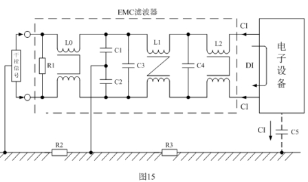 根據(jù)EMC的定義或原理,EMC濾波電路不但要抑制本電子設(shè)備產(chǎn)生的電磁干擾,同時(shí)也要對(duì)外來(lái)的電磁干擾信號(hào)進(jìn)行抑制,因此,圖14所示的EMC濾波電路還不是十分完美的。為了提高EMC濾波電路對(duì)外來(lái)電磁干擾信號(hào)的抑制能力,最好在輸入端也安裝一個(gè)低通濾波器,并且這個(gè)低通濾波器對(duì)本電子設(shè)備產(chǎn)生的電磁干擾也有很強(qiáng)的抑制能力。
