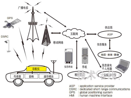 首先介紹車載導航儀的多功能化和高速化。眾所周知,車載導航儀的出發(fā)點是導航,然后才是通過DSRC(Dedicated Short Range Communications )、電視、移動網(wǎng)絡等通信手段與車外相連接。現(xiàn)在,車載導航儀已不再是單純的指路工具,而是發(fā)展成為了能夠借助各類供應商進行多種內(nèi)容交換的雙向交流裝置。為了向駕駛員提供安全、放心、便利、舒適的駕駛環(huán)境,車載導航儀正在向聯(lián)結(jié)人與機械(這里指汽車)的HMI(Human Machine Interface)中心轉(zhuǎn)變(圖1)。